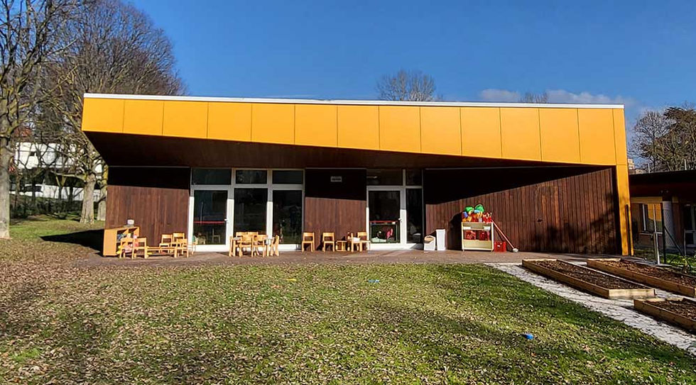 Realizzazione della facciata ventilata di una scuola materna in HPL con fissaggio a scomparsa.